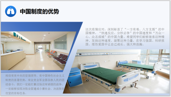 本次主题班会充分展示了我国疫情防控成效,增强了我院学生科学防护知识和能力,使他们深刻认识到中国特色社会主义制度优越性,激发了我院学生爱党爱社会主义的热情。