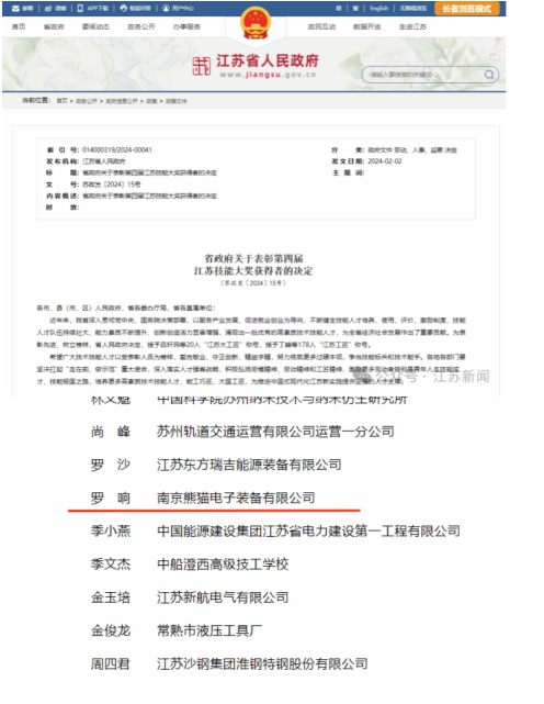 日前,江苏省人民政府发布《省政府关于表彰第四届江苏技能大奖获得者的决定》,南京熊猫电子装备有限公司智能制造研发中心电气科科长、我院永利yl23411集团2019届自动化专业优秀校友罗响被授予“江苏工匠”称号。